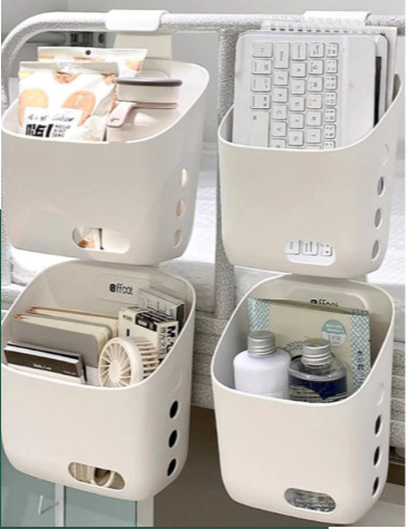 욕실 세면대 위가 지저분하다면 걸이형 수납 바구니를 추천합니다. 핸드워시, 면도크림, 치약 등 세면도구를 보관하기 좋고, 바닥에 물 빠짐 구멍이 있어 위생적이에요. 여러 개를 연결하여 공간 효율을 높일 수도 있습니다.